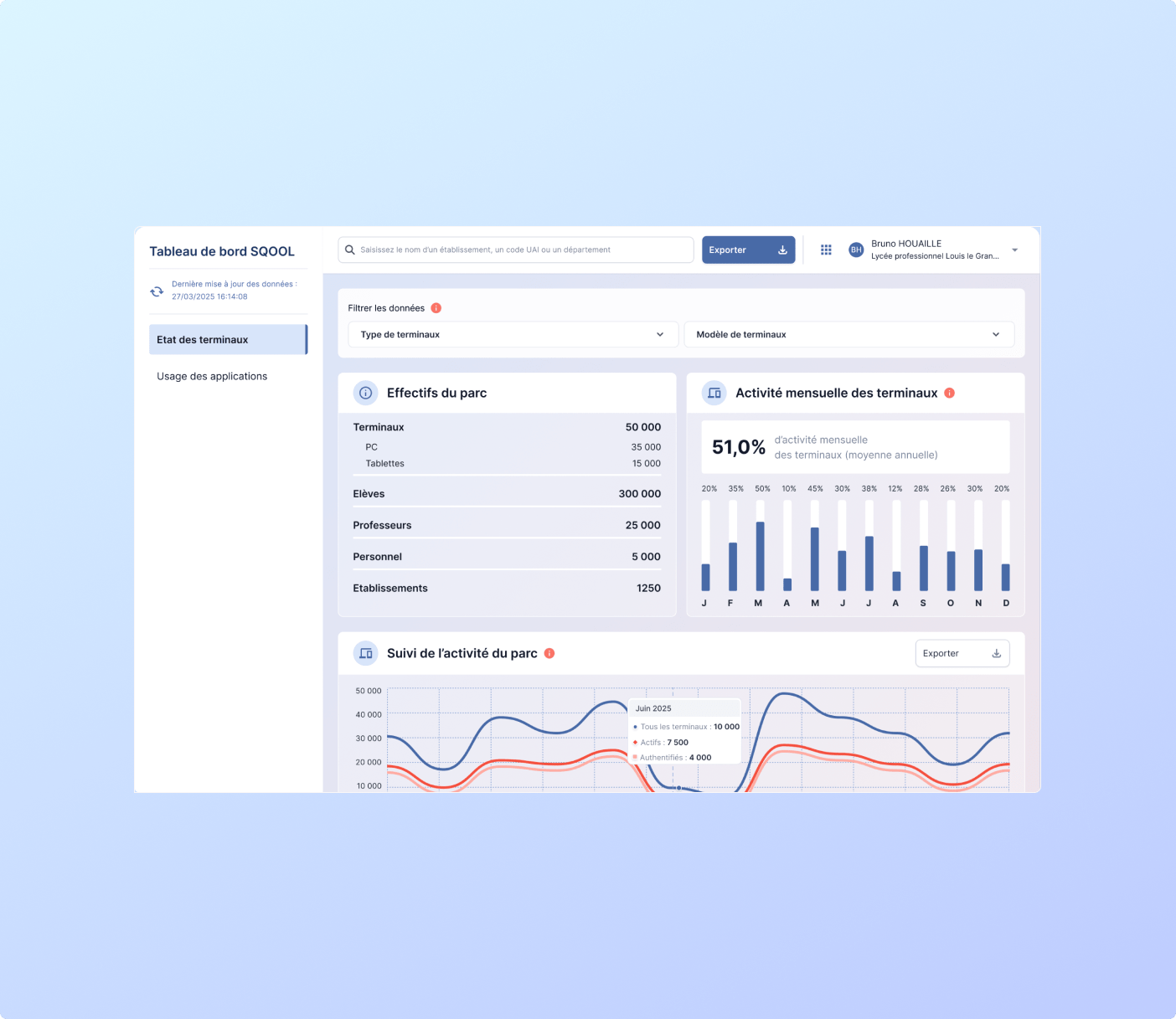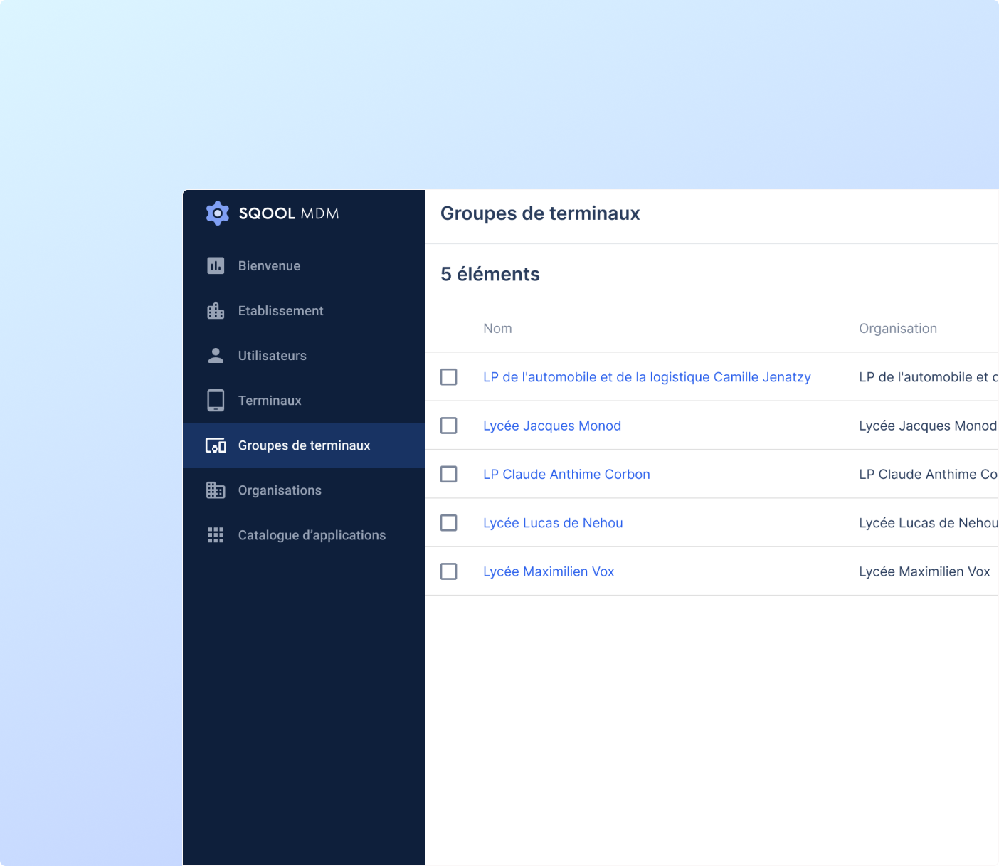 Oui. Grâce à SQOOL MDM, vous centralisez les mises à jour et configurations, contrôlez les usages, gérez les profils utilisateurs, et assurez la sécurité des appareils à distance (verrouillage, géolocalisation, effacement en cas de perte…). De plus, la gestion du parc peut être délégué directement aux établissements scolaires.